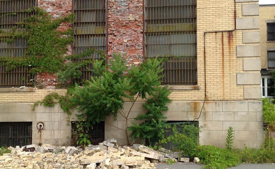 The building has started to come apart. Paint falls off the ceiling inside, while outside loose bricks have started to pile up and overgrown shrubs peek out of the chimney.